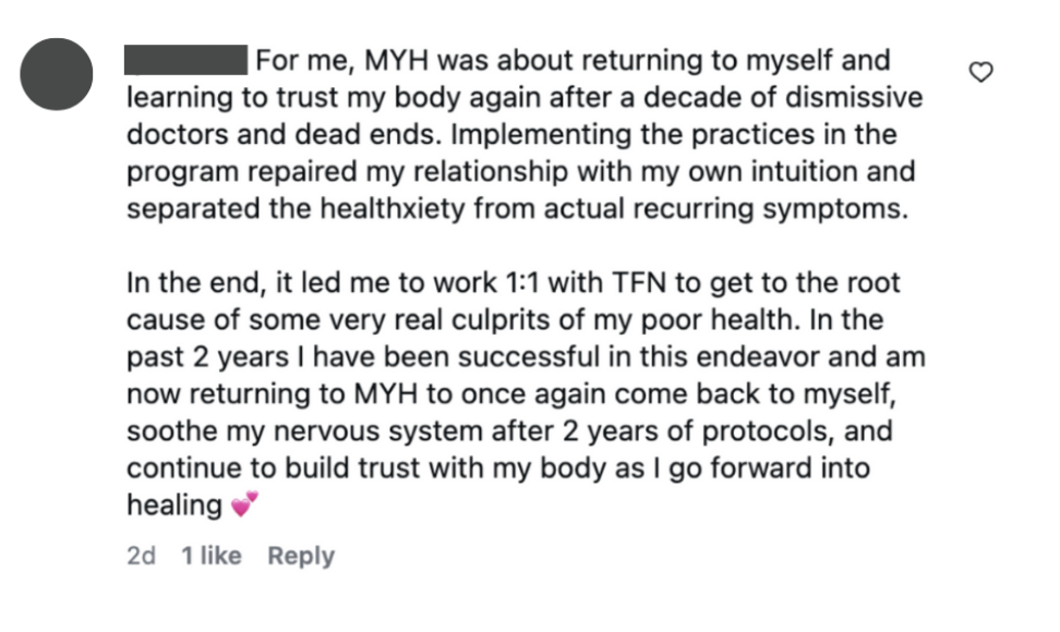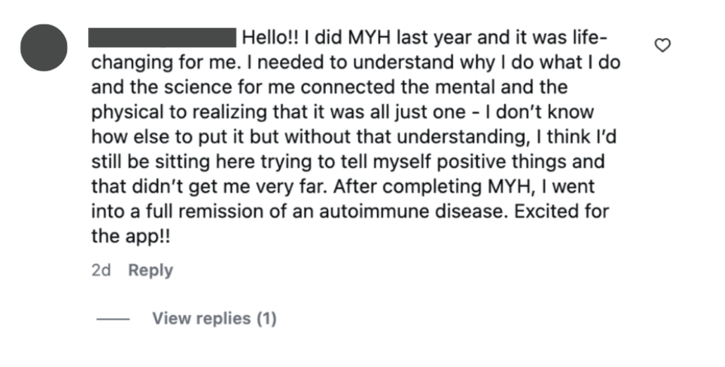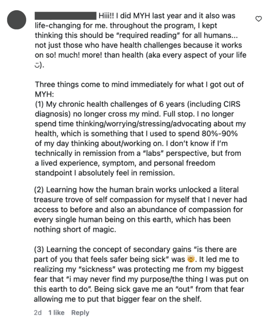 I had a colonoscopy today - and they found no active Crohn's! This is amazing news - I was diagnosed 20 years ago and have been on a biologic for many years. I chose to stop it in June, as I continued work on the root cause of inflammation. And MYH X2 has definitely played a huge role in healing and giving me tools that I love to use. In this second round, the identity work really started to click for me and I'm excited to continue this path! Thank you for creating this course and helping me learn how to heal!! There is still some inflammation, but I feel so prepared to continue on my journey.