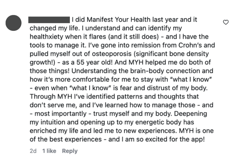 And so I decided to find a new way to heal. That’s where Manifest Your Health came from.