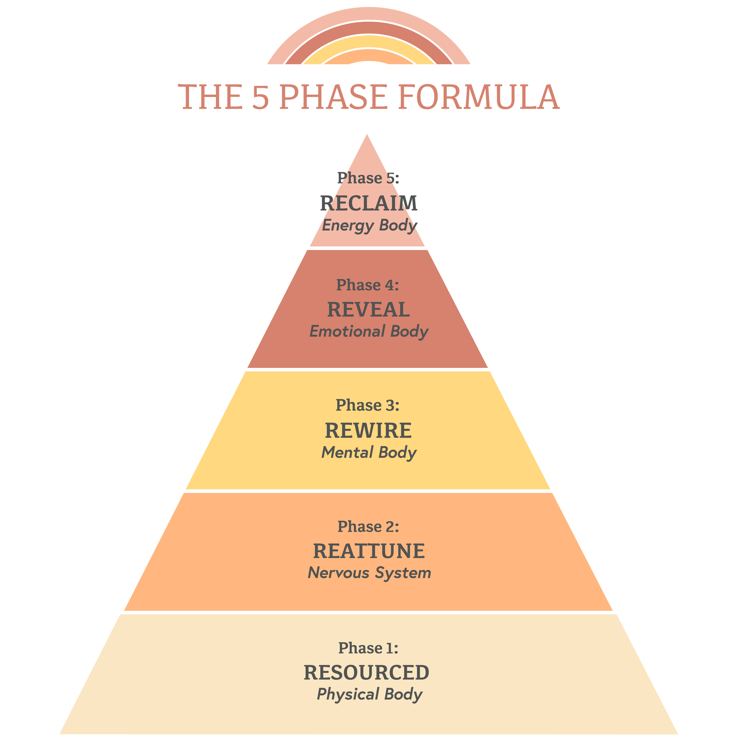 Each phase builds on the others. You’ll move through them in a specific order, at your own pace. Regulate, reattune, rewire, reveal, and reclaim.